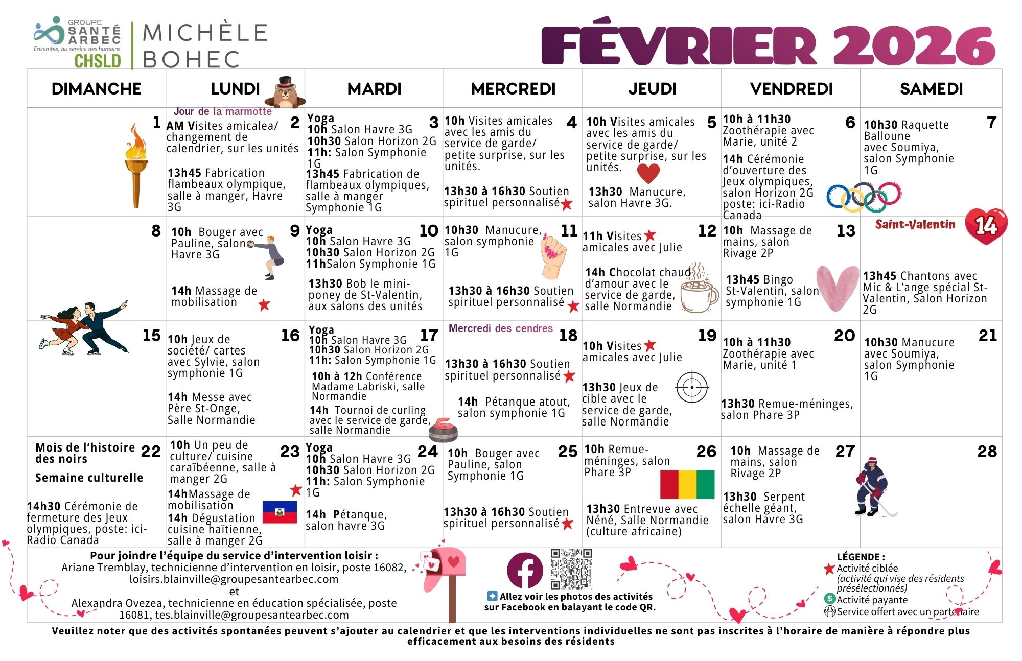 Activités de loisirs du mois de février 2026 pour les résidents du CHSLD Michèle-Bohec