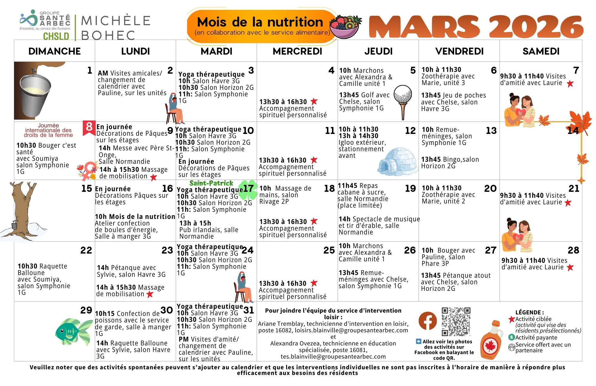Activités de loisirs du mois de mars 2026 pour les résidents du CHSLD Michèle-Bohec