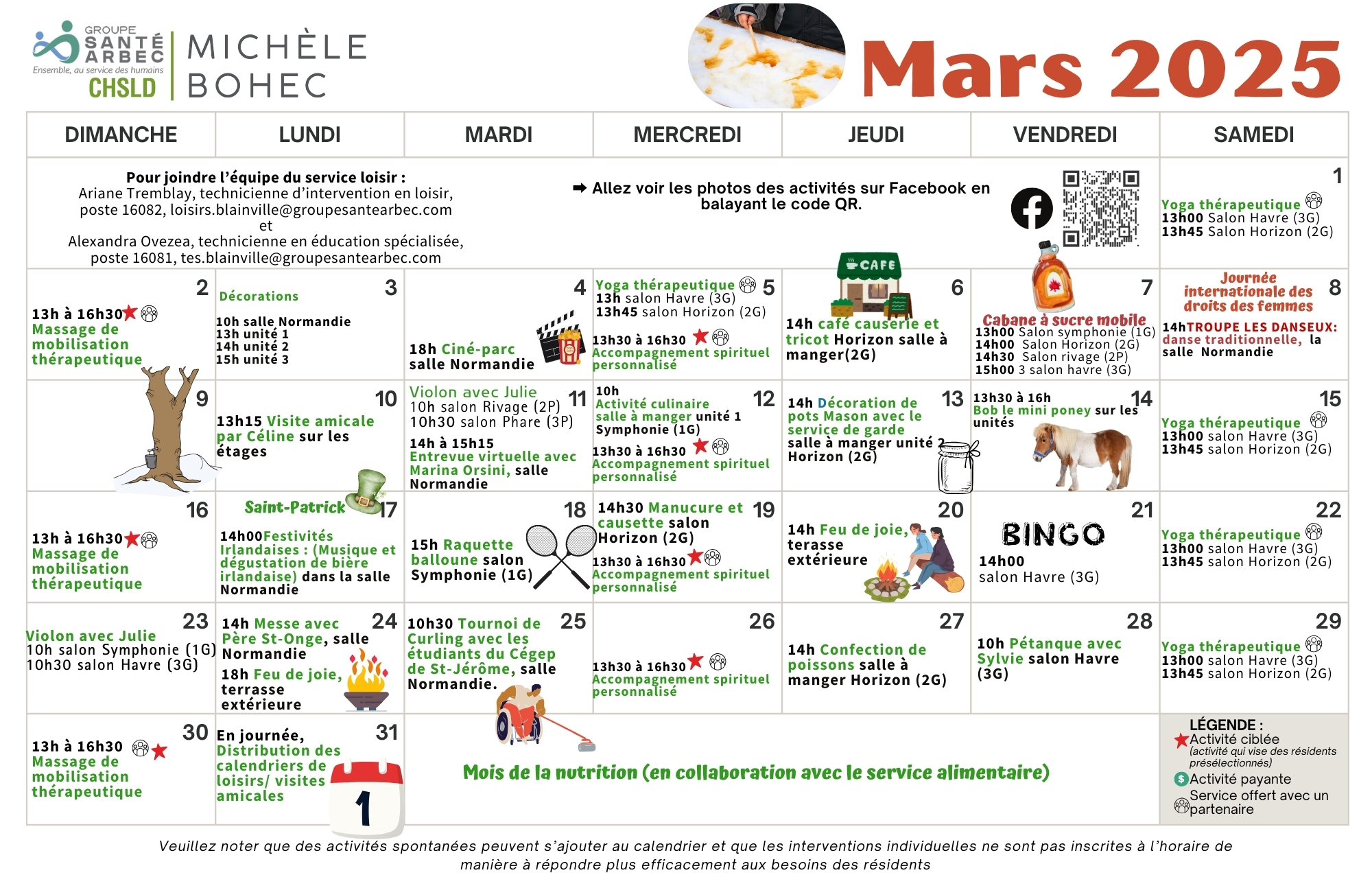 Activités de loisirs du mois de mars 2025 pour les résidents du CHSLD Michèle-Bohec