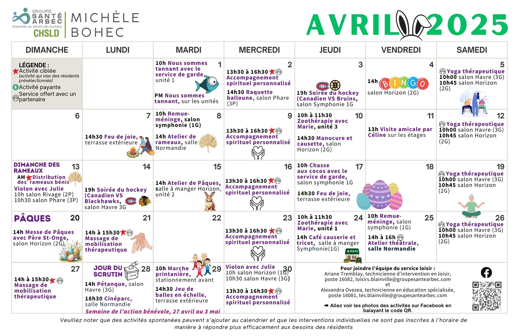 Activités de loisirs du mois d’avril 2025 pour les résidents du CHSLD Michèle-Bohec